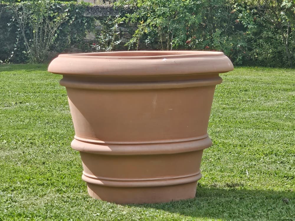 Forme: Pot traditionnel Toscan sans décor avec rebord, de forme conique tronquée à sa base.