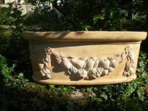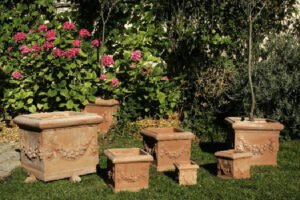 JARDINIERES: En terre cuite de Toscane. Disponibles en 3 modèles: lisses (8 tailles), festonnées (8 tailles) ou autres (3 modèles: putti, lunettes, alta).
