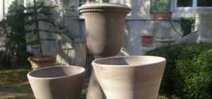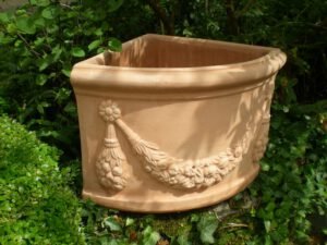 QUART ET DEMI POTS: En terre cuite de Toscane. Quart de pots: pour un angle. Demi-pot et « tasca » pour aller contre un mur. Formes cylindre ou « conca ».