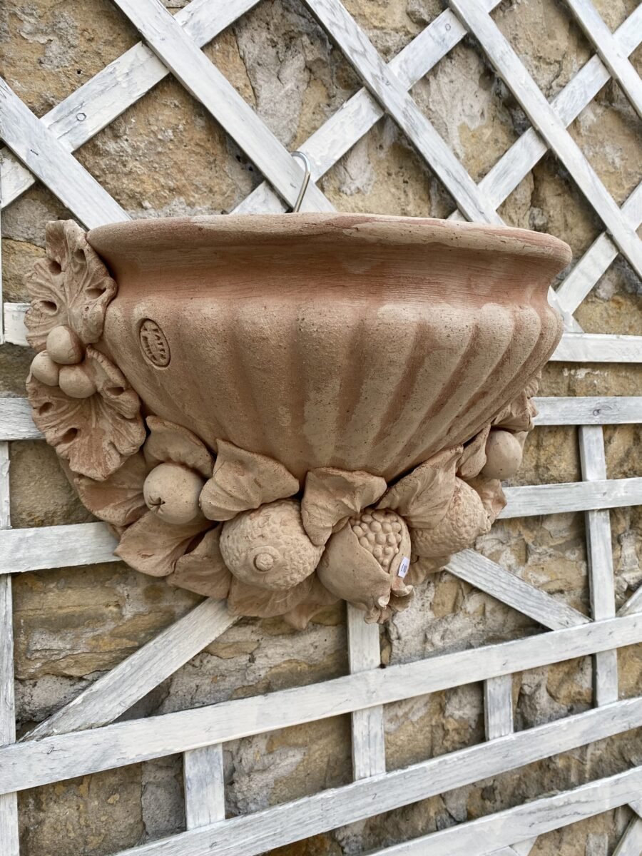 TASCA CON FRUTTA APPLICATA : Il s’agit d’un demi pot destiné à être accroché à un mur. Le décor est constitué de fruits. Cette « tasse » est destinée à recevoir plutôt des plantes tombantes.